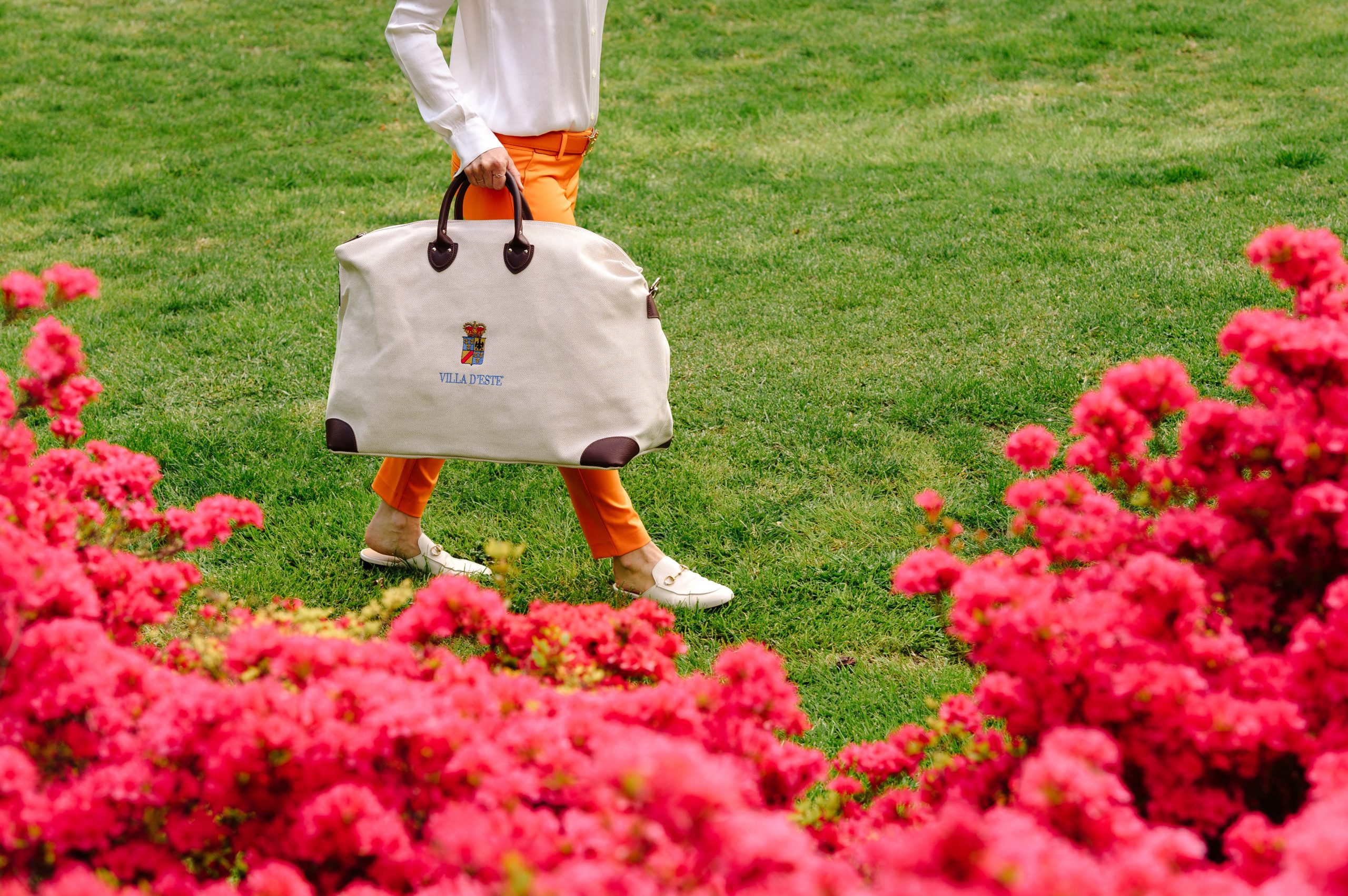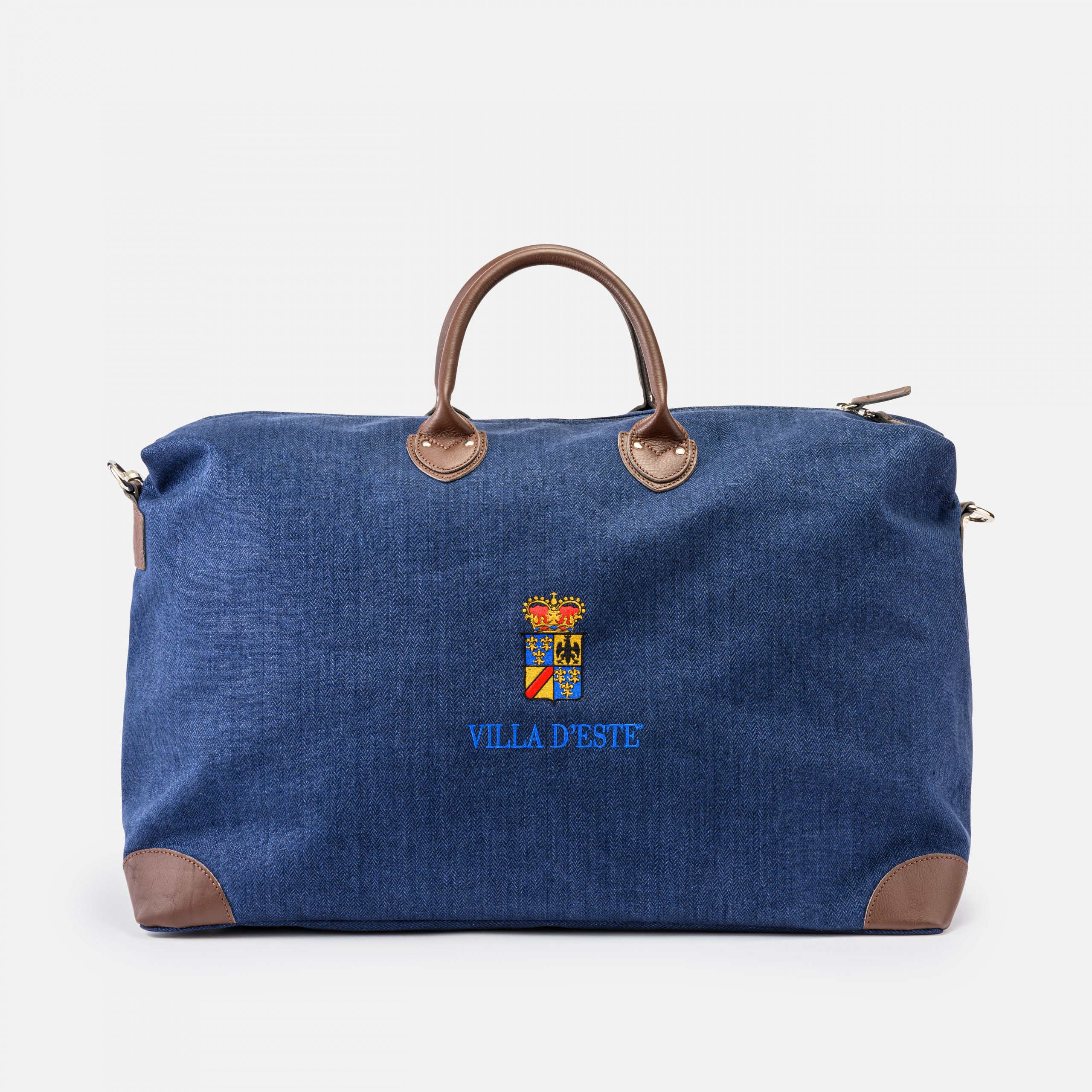 Perfetto per i viaggi, lo sport e il tempo libero, questo borsone da viaggio in tessuto spigato è molto curato esteticamente grazie ai dettagli in cuoio che risaltano sui colori accessi del blu, dell’azzurro o del beige. Molto elegante lo stemma Villa d’Este colorato, cucito al centro.