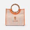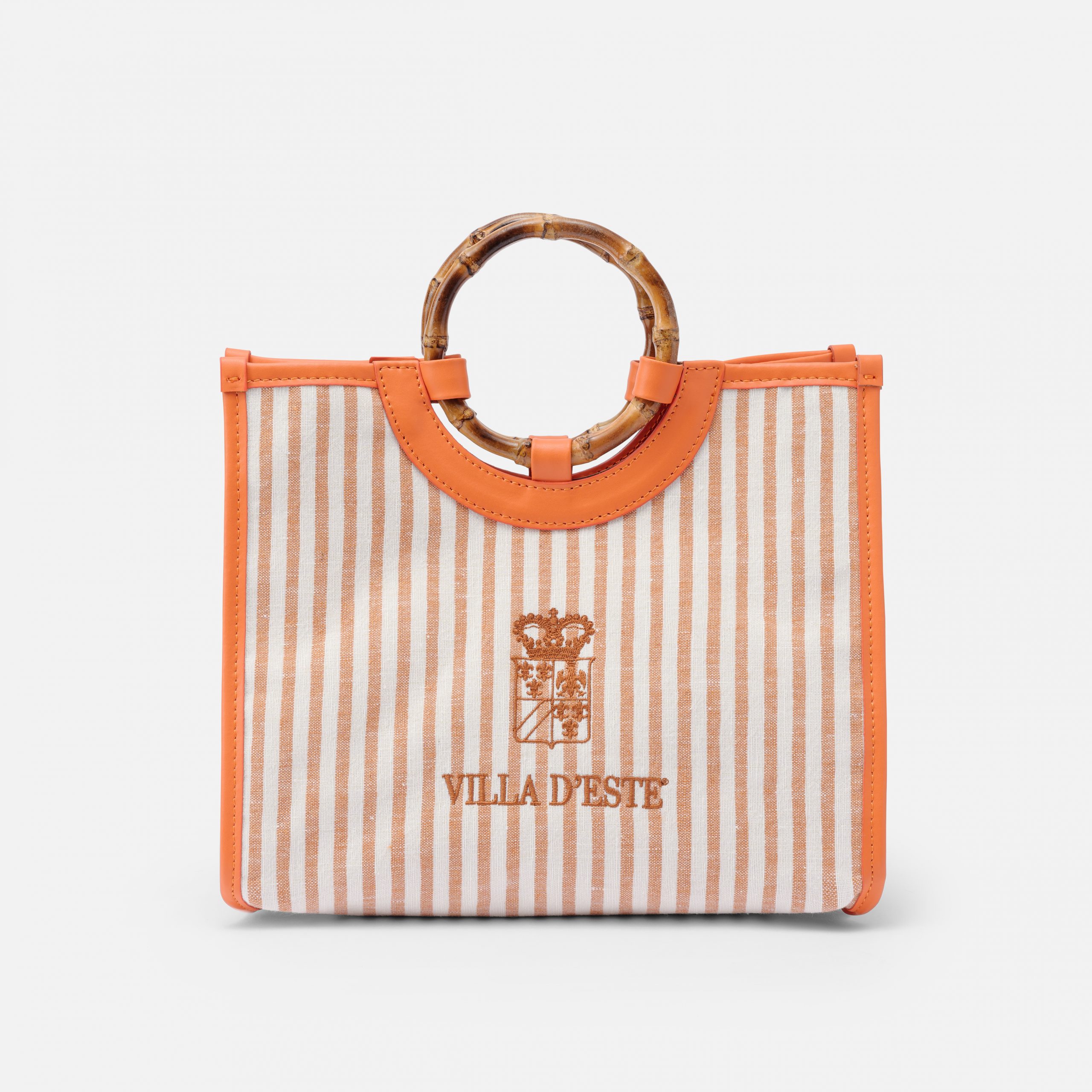 Lino e cotone con dettagli in pelle e manici in bamboo.